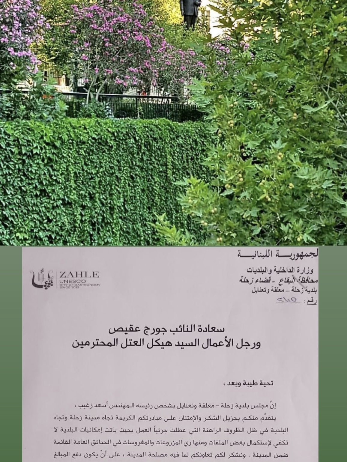 ثمنت جمعية درب الكروم البيئية مبادرة النائب جورج عقيص و رجل الاعمال هيكل العتل في تأمين تكلفة ري الحدائق و الاشجار في زحلة طيلة فصل الصيف لعدم القدرة المالية للبلدية .