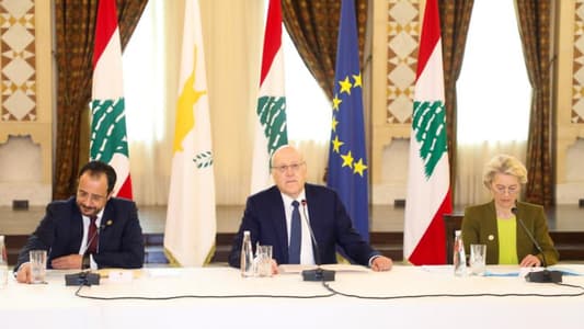 وأشار ميقاتي، بعد لقائه الرئيس القبرصي نيكوس خريستودوليدس ورئيسة المفوضية الأوروبية أورسولا فونديرلاين إلى أن "أمن لبنان من أمن دول أوروبا والعكس ونرفض أن يتحوّل وطننا إلى وطن بديل"، مؤكداً أن "المطلوب كمرحلة أولى الإقرار أوروبياً ودولياً بأنّ غالبية المناطق السورية باتت آمنة بما يسهّل عملية إعادة النازحين".