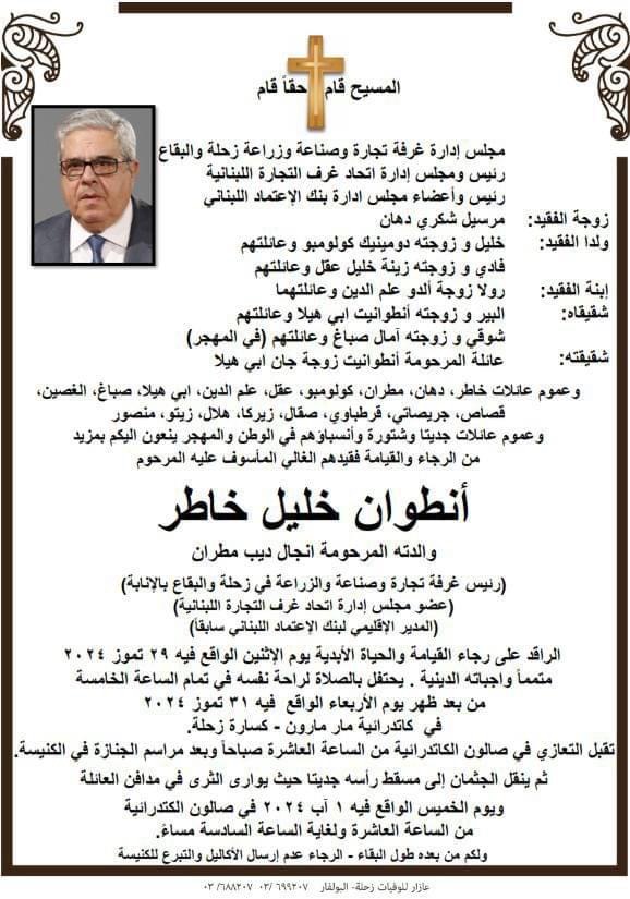 بمزيد من الاسى واللوعة ينعي مجلس إدارة غرفة التجارة والصناعة والزراعة في زحلة والبقاع الرئيس بالإنابة المأسوف عليه أنطوان خليل خاطر ويعبر عن حزنه الشديد لرحيل من كان له اسهامات في خدمة الاقتصاد البقاعي من خلال انضمامه لمجلس إدارة غرفة زحلة والبقاع منذ العام 1992 ومن خلال انتخابه نائباً للرئيس في العام 1997 ، ورئيساً بالإنابة لمجلس الإدارة بعد رحيل المغفور له ادمون جريصاتي فكان خير خلف لخير سلف. سمته الجمع ووصل ما انقطع على الصعد كافةً بين الشرائح الوطنية والاقتصادية والاجتماعية . شغل مناصب عدة منها في مجلس إدارة اتحاد غرف التجارة اللبنانية، وبإعتباره مصرفياً ورجل اعمال ناجح شغل منصب المدير الإقليمي لبنك الاعتماد اللبناني سابقاً في محافظتي البقاع والجنوب والنصف الجنوبي من محافظة جبل لبنان . وبعهده توسعت فروع البنك وانتشرت في مختلف انحاء البقاع. وبالرغم من الظروف الصعبة والقاسية التي مر بها لبنان ولايزال، استطاع المأسوف عليه أنطوان خاطر وبدرايته وحكمته وخبرته المالية والمصرفية ان يحافظ على وتيرة عمل غرفة زحلة والبقاع ، ومتابعة اعمالها واعمال المنتسبين اليها وحل مشاكلهم ، فواظب على الحضور الى مكتبه في الغرفة بالرغم من مرضه لمتابعة تجهيز وتحديث مكاتبها وانظمتها بكل ما هو جديد على الصعيد الإداري والتقني والعملي .