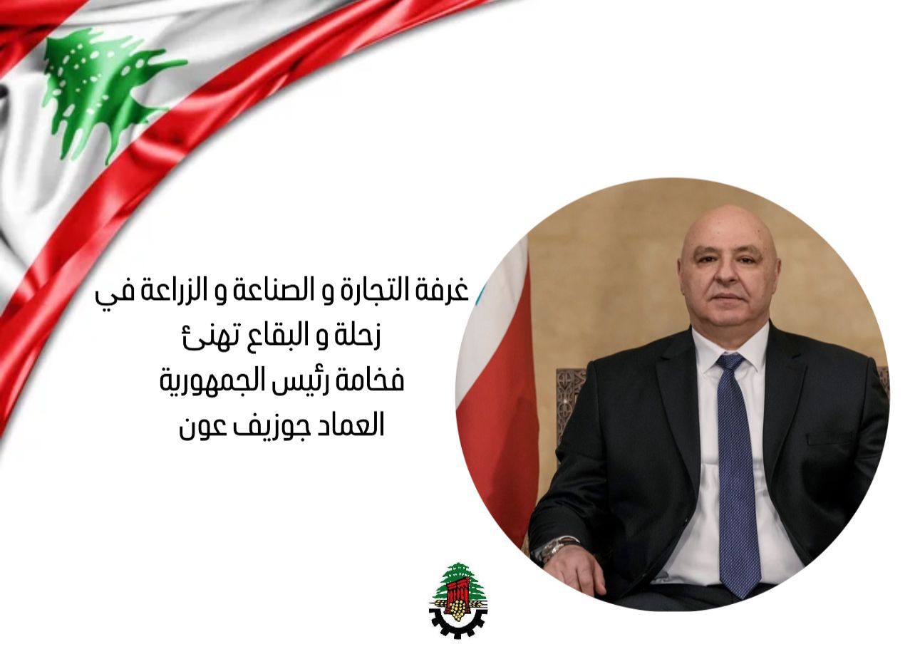 غرفة تجارة زحلة والبقاع تبارك للرئيس جوزف عون: كلنا أمل بأن يشهد عهدكم خطوات جريئة ومثمرة